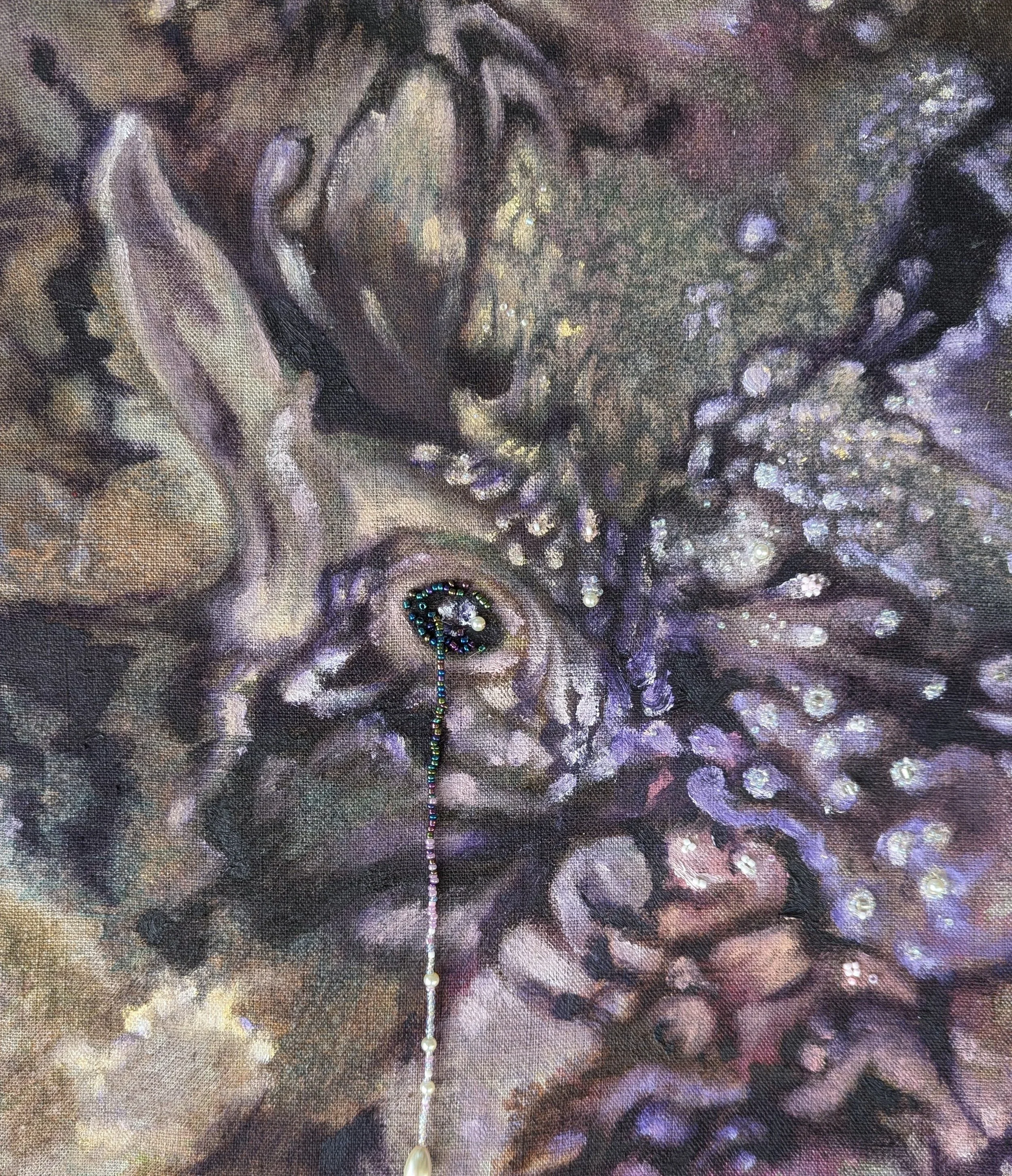 She treats the surface more like a textile than a painting: Folding, beading, and dyeing it with ink. Rubbing wax into areas to create resists and using salt to encourage the pigment to dry in interesting ways. Glass, wax, salt, flax, cotton, oil, water and pigment all speak to a type of alchemy. For Bonnie, painting is deeply rooted in a fixation with analogue process and construction. She chases relationships between the subject, symbolism and materials: Following patterns made through the dying process, arranging images to emphasise them and embellishing parts of the narrative she wants to romanticise.