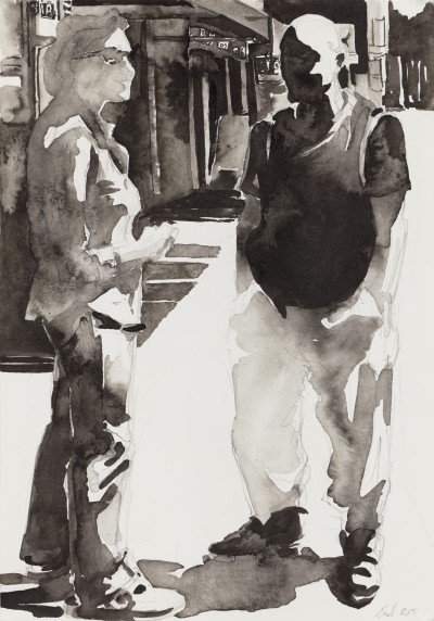 With their genesis in iPhone snapshots—many photos taken at peak hour around the city circuit—the drawings are in dialogue with photography without being photographic, creating a very different feel than Robert Longo’s drawings, Men in the Cities (1973/1983).[ii] The images are unashamedly drawings and their grainy charcoal materiality and scale or their fluid material presence implicates us as by-standers in some familiar yet uncanny reality. Here, each figure has its own positionality, its own light source and vanishing point yet there is no ground on which to fix them. The repetition across the frieze-like format creates a rhythmic dynamic, moving us across the image in fits and starts so that we may encounter the different viewpoints that each individual figure creates. The shifting and multiple perspectives produced through these ruptures may remind us of David Hockney’s photographs and recent paintings,[iii] Picasso’s simultaneous perspective and Cezanne’s inexplicable still life paintings that hover and quiver under our gaze. Drawings such as Reconciliation Elegy ask us to consider our own positionality in relation to the other, not just as viewers but also as political beings. It niggles and gives hope that imaging does have the power of interpellation and injunction and that places a responsibility on us as both makers and viewers of images.