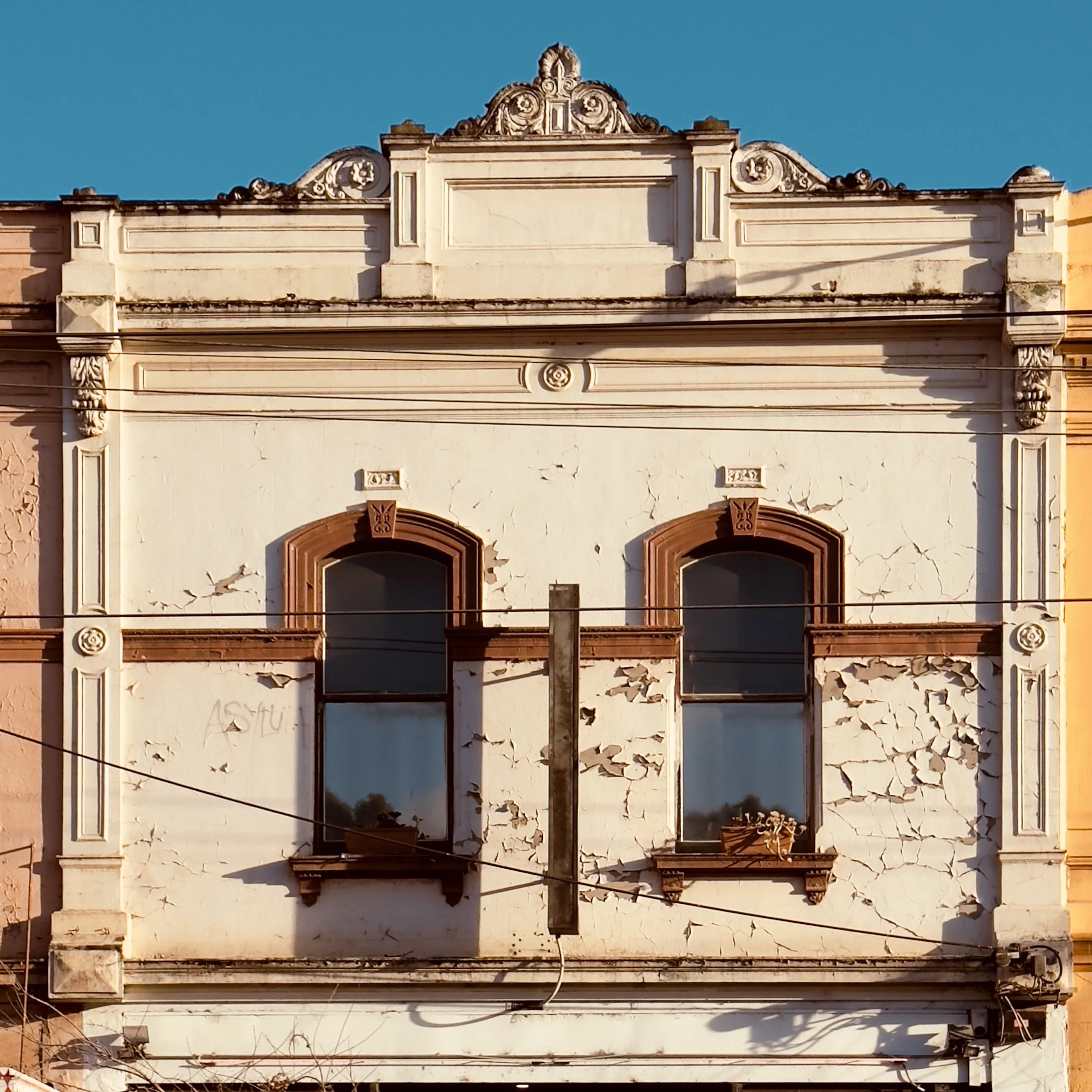 The Northside of Melbourne, Fitzroy North, in particular, stands as a testament to Melbourne’s 1880s boom—the era of “Marvellous Melbourne”—when developers and owners poured care and craftsmanship into their buildings. During this time, great pride was taken in creating façades that stood out: decorative brickwork, elaborate pediments, capstones, stained glass windows, and finely detailed parapets were common. Each row of terraces or shops tried to outdo the next, resulting in streetscapes that, when viewed above eye level, still display remarkable cohesion and artistry.