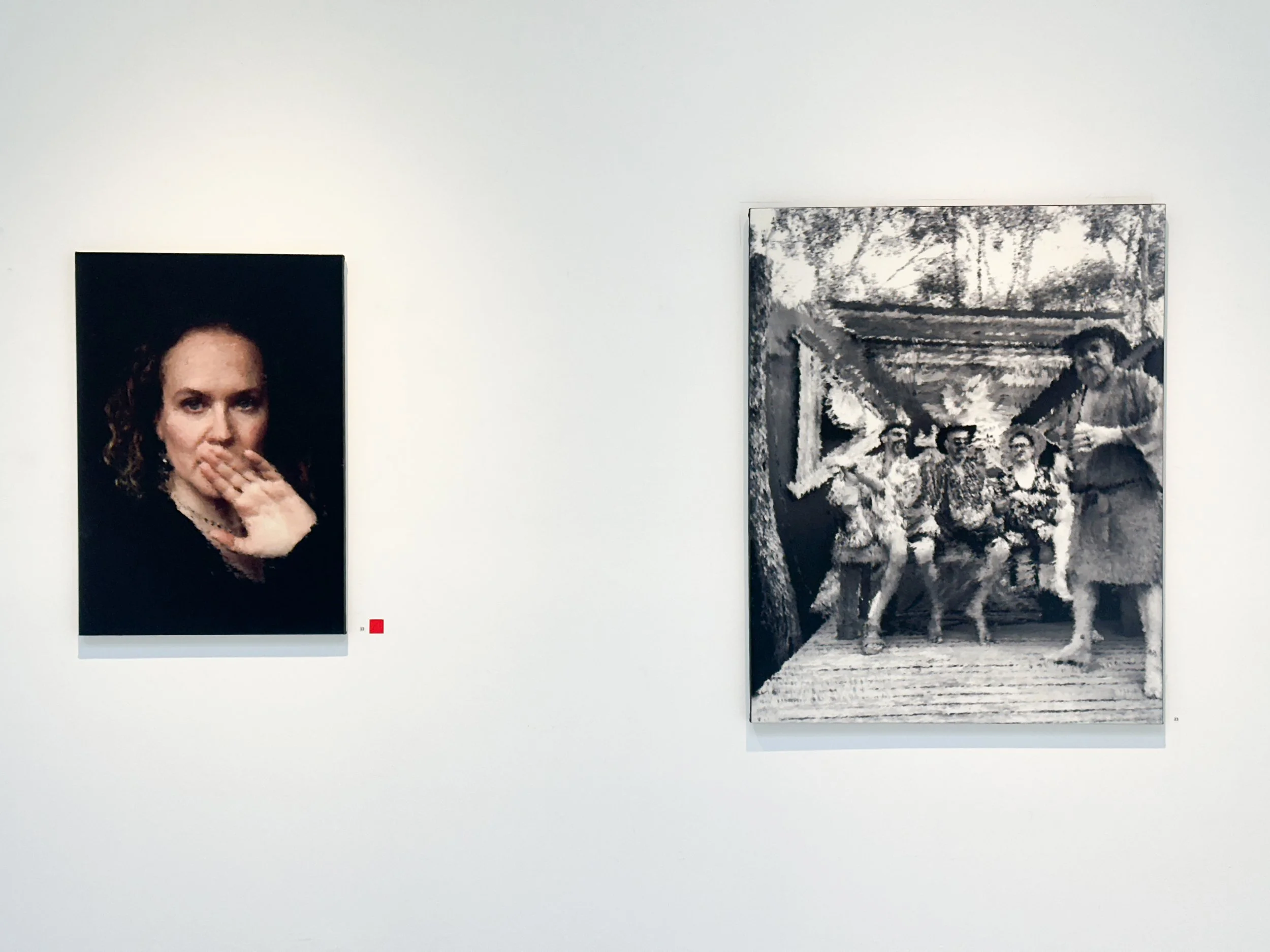 The works challenge our vision, now altered to accommodate a world dominated and mediated by screens. We increasingly experience faces and bodies flattened into glowing rectangles, pixelated, endlessly consumed. Source material for studio portraiture is no longer a living model, but photographs, digital images, projections. These paintings echo that shift—not to critique it, but to hold it up, to dwell inside it, to ask what it does to intimacy, memory, and the act of seeing, itself.